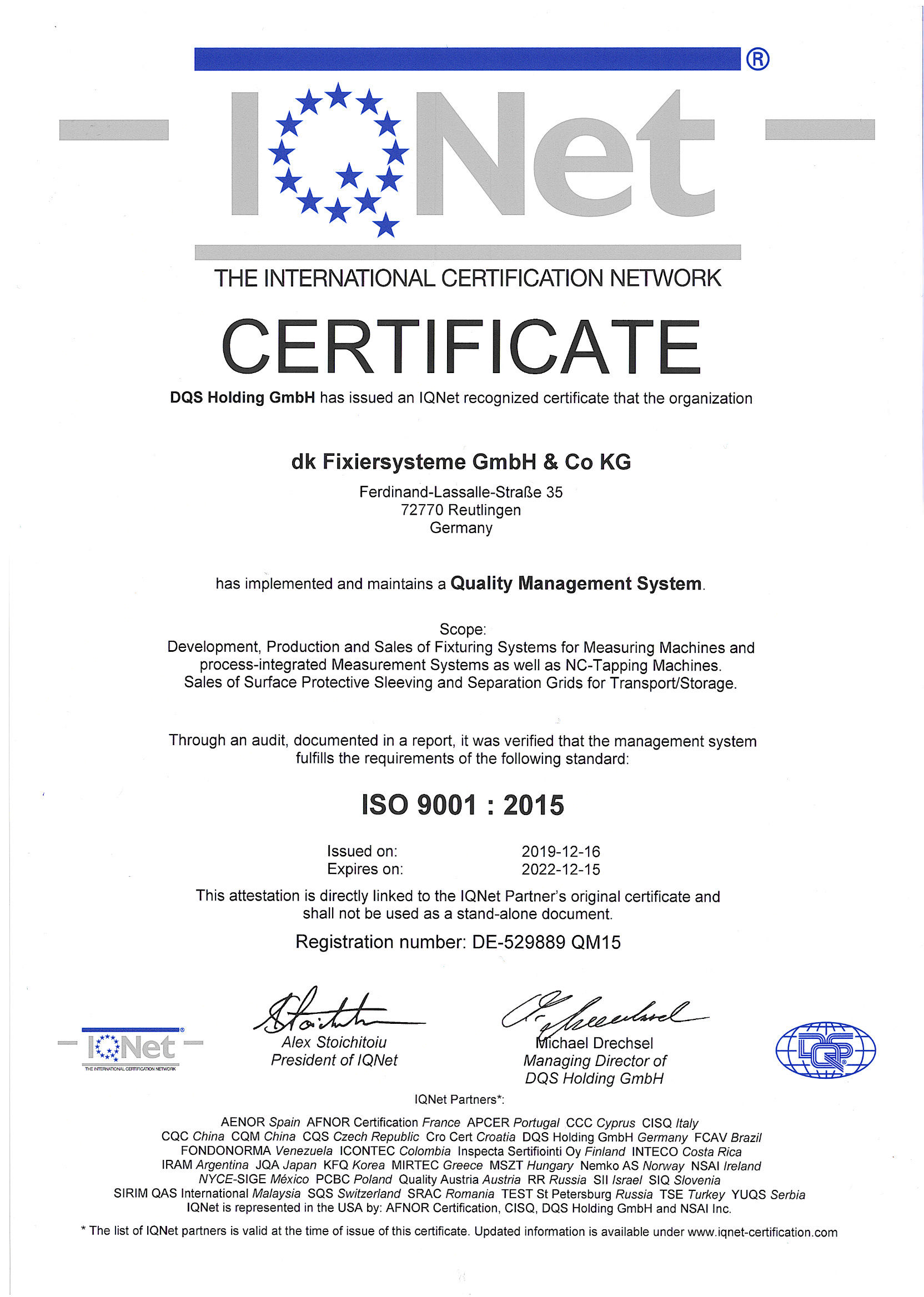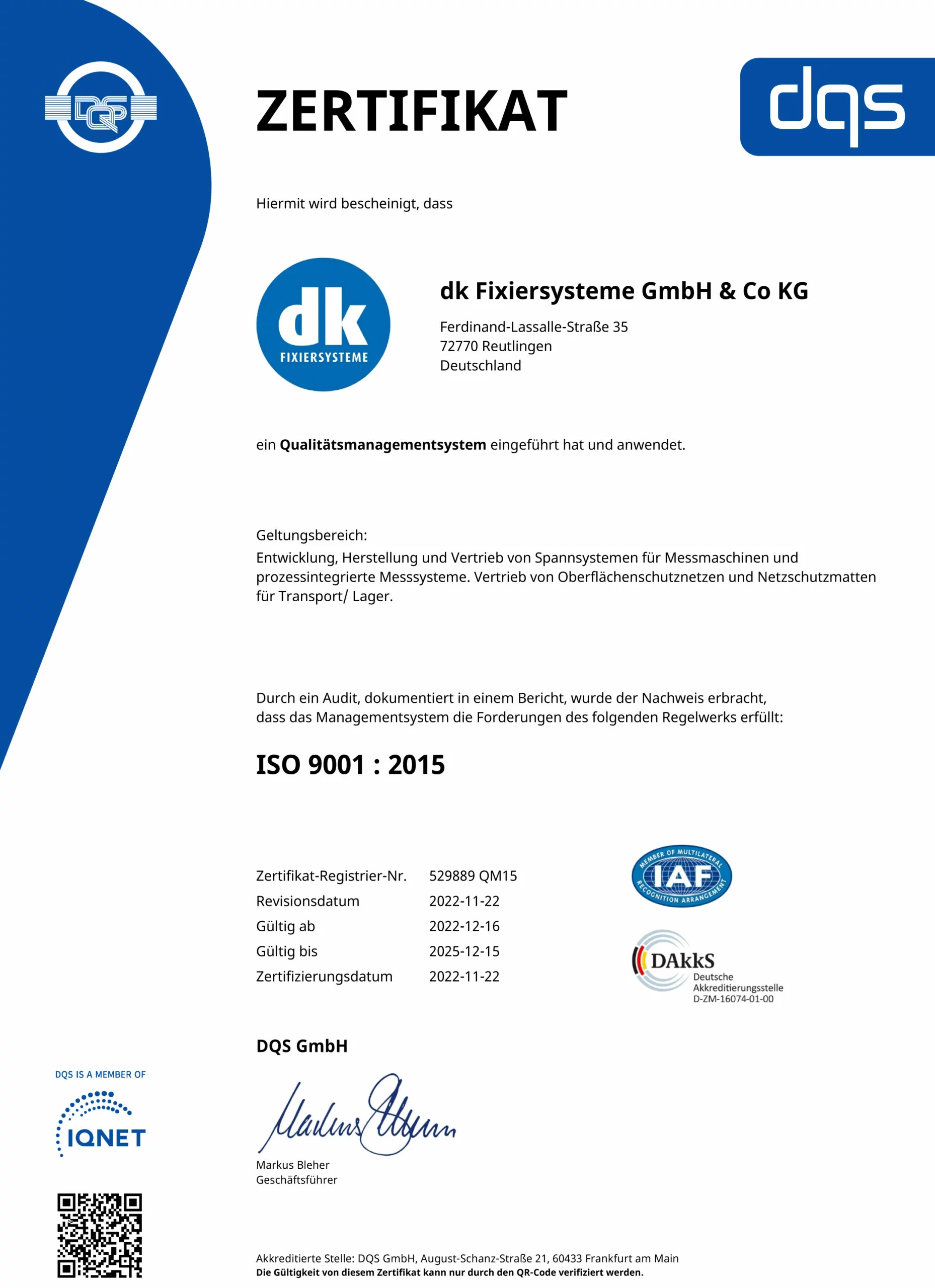 Um den Kunden dies zu belegen, ist dk FIXIERSYSTEME nach ISO 9001 : 2015 zertifiziert, was ein weltweit anerkannter Beleg gegenüber Kunden, Partnern und Lieferanten für unser organisiertes Qualitätsmanagement